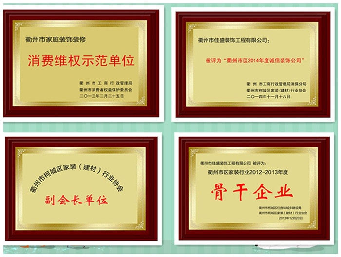 2011年被衢州市工商行政管理局評(píng)為衢州市家庭裝飾消費(fèi)維權(quán)示范單位;